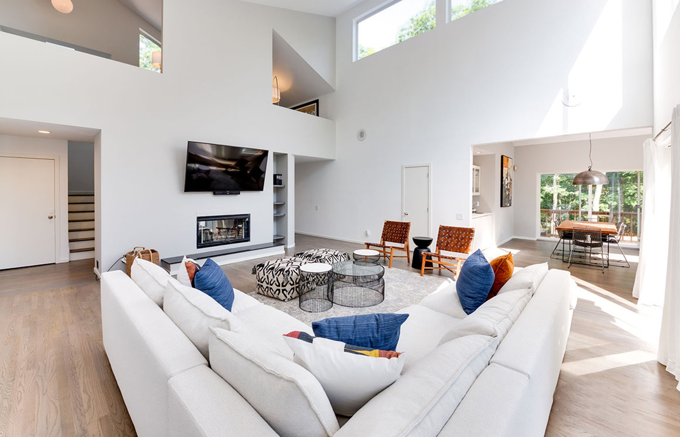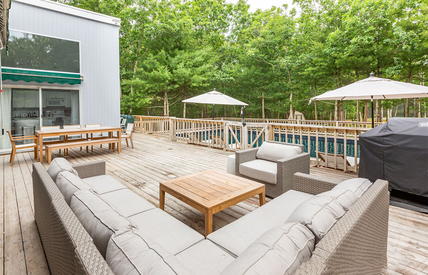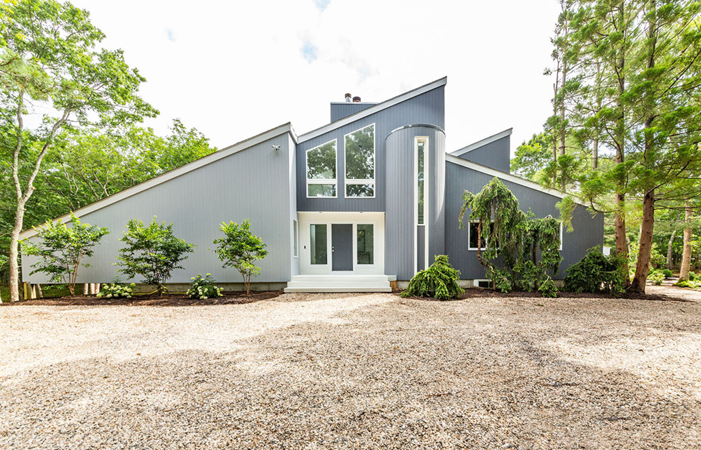 Set on an ultra-private 2.5-acre estate, this stylish modern residence embodies the best of contemporary Hamptons living—where design, comfort, and coastal sophistication meet. Bathed in natural light, the open-concept layout features a soaring double-height living room with fireplace, a sleek eat-in kitchen with informal dining area, and a custom wet bar for effortless entertaining.