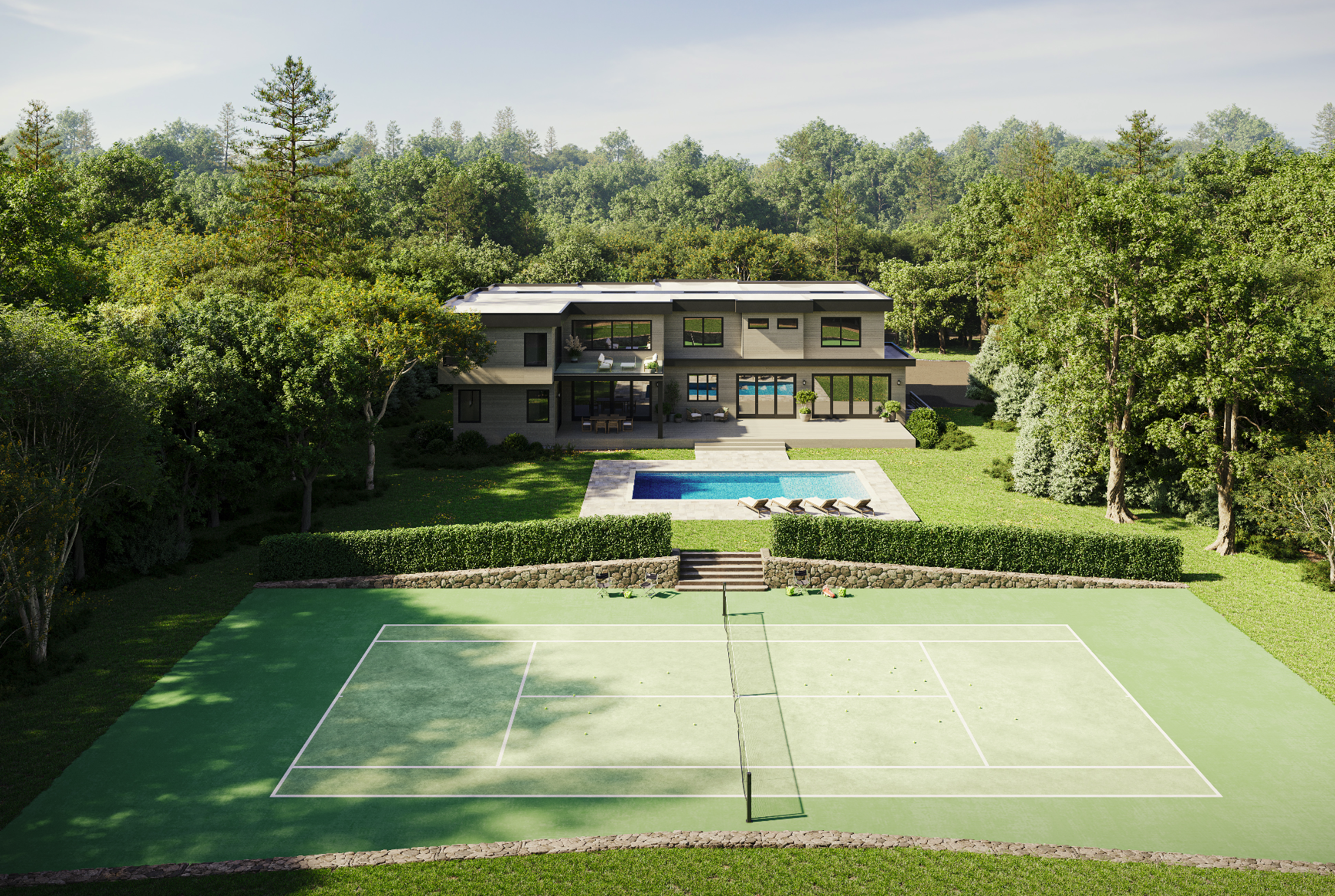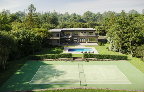 The separate great room, perfectly suited for memorable evenings besides its own fireplace, will resonate with conversation and laughter. The main level also features a formal dining room, stylish guest suite, powder room, and an oversized two-car garage Ascending the floating metal staircase with glass railings one finds the primary wing, a serene sanctuary with radiant-heated spa bath, soaking tub, glass-enclosed shower, dual walk-in closets, and a spacious sleeping chamber with private balcony. Four additional guest suites-each with private baths and walk in closets share their own family room. A convenient laundry room completes the second floor. The lower level is pure entertainment: a tiered home theater with immersive audio-visual system, a gym area, powder room, recreational lounge, and two private bedroom suites that share a bath are perfect for staff or the weekend overflow. An elevator connects all three levels. Outdoors, expansive stone terraces-both covered and open-frame the 20′ x 40′ heated Gunite pool with spa, surrounded by sleek porcelain tile and lush, professionally designed landscaping. Beyond that lies your own all-weather tennis court, completing the perfect resort-like tableau. Every detail reflects thoughtful luxury: 600-amp electrical service, 6-zone high efficiency HVAC, Sonos sound system, Shuco European windows, LED lighting, central vac, foyer chandelier lift, and prewiring for cable and WiFi throughout. With new construction at this level increasingly rare-especially with tennis and customization still possible-this is your moment to claim a legacy Hamptons residence that promises to be nothing short of sensational. Contact us today for further details or to arrange your private preview before this opportunity disappears.