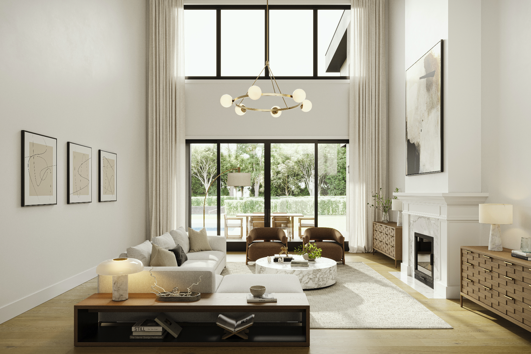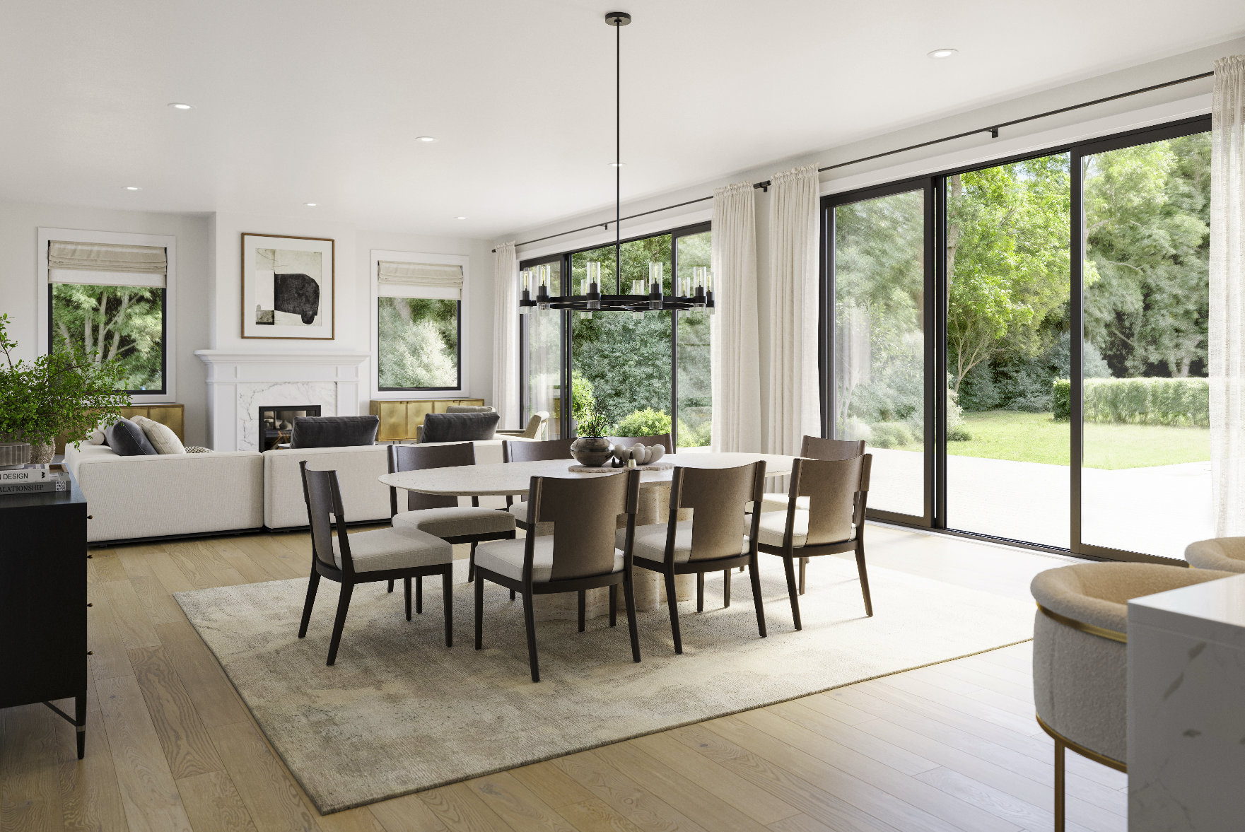 M & M Custom Homes is bringing its signature craftsmanship and visionary design to Great Hills-an exclusive new Southampton enclave where three extraordinary estates are taking shape. The first of these masterworks is already rising: a modern 8 bedroom Hamptons residence that redefines four-season living through nearly 10,000 square feet of brilliantly executed space across three magnificent levels. A soaring double-height foyer sets a dramatic tone, as sunlight dances across 8.5 -inch white oak floors leading into an open, free-flowing layout. The living room, anchored by a sleek fireplace, blends seamlessly with breakfast area and a state-of-the-art kitchen outfitted with professional-grade Sub-Zero and Wolf appliances, dual dishwashers and sinks, a stunning center island with seating, and bespoke acrylic cabinetry topped with exquisite stone and quartz.